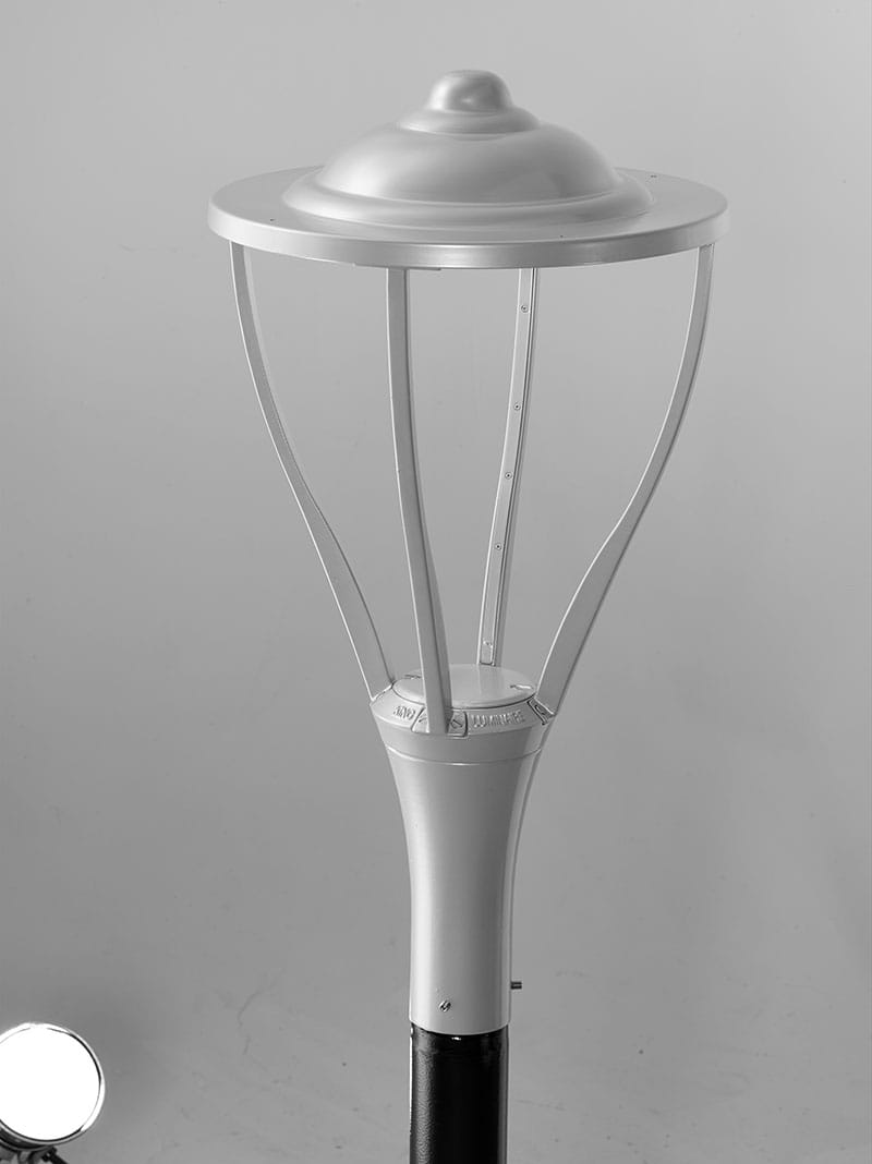 The tallest luminaire in the Skyline series, the K584 Treble Strut will sit gracefully on top of any of King Luminaire metal poles or StressCrete spun concrete poles. Shown with the trump spinning, but like all fixtures in the series, it can be combined with any of the four spinnings for a look that is truly unique.
